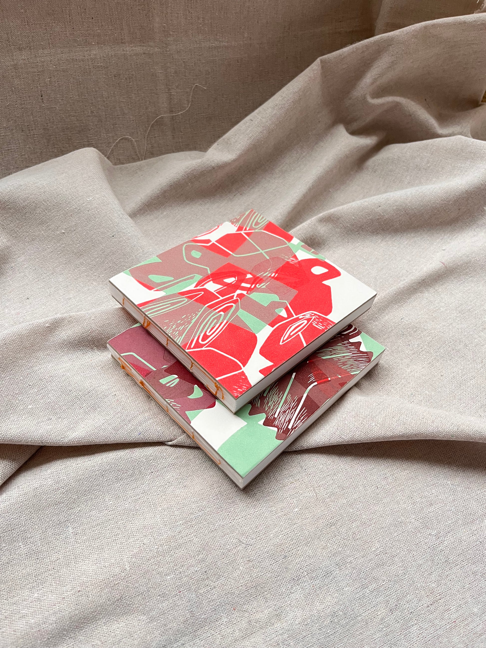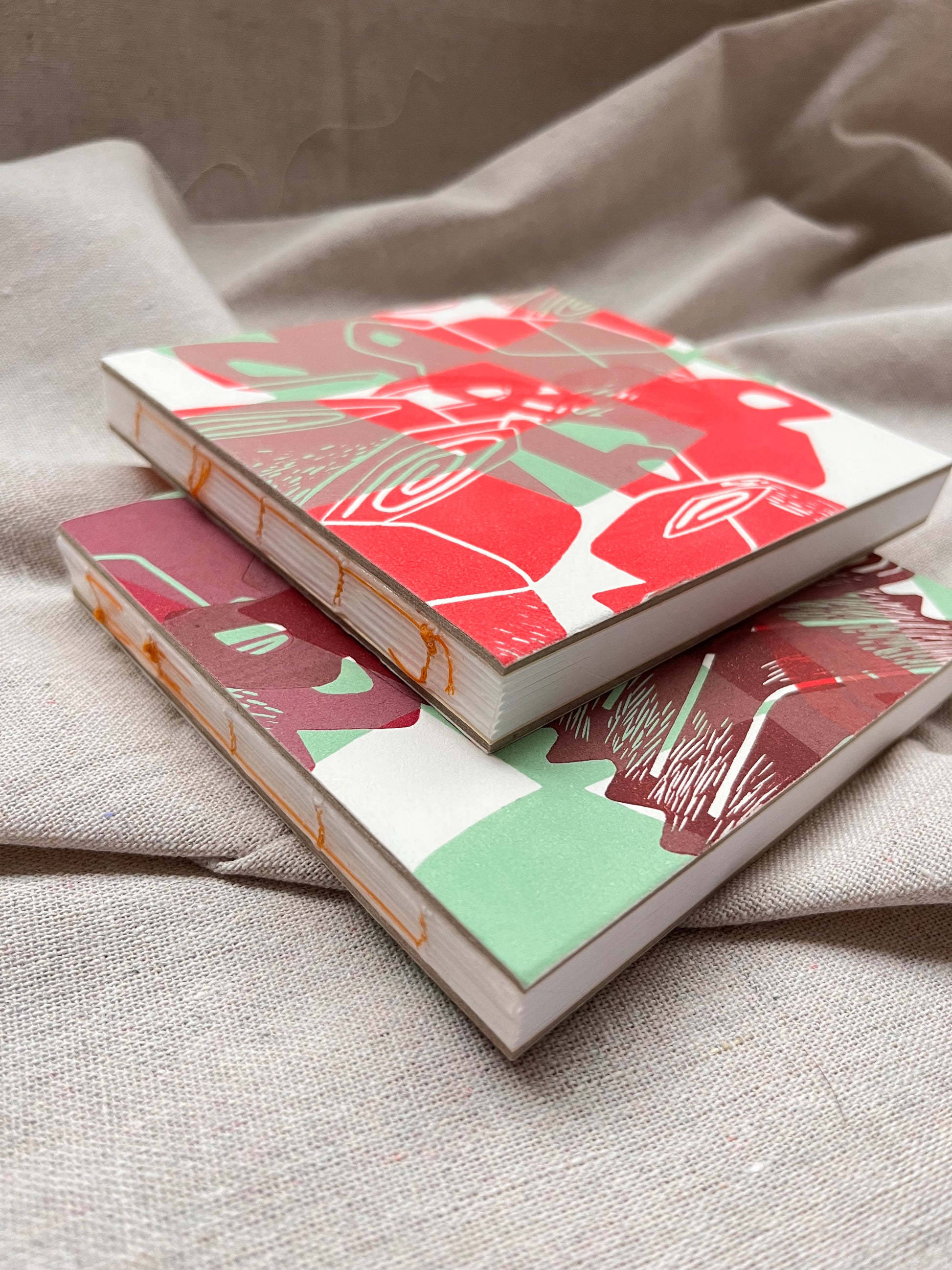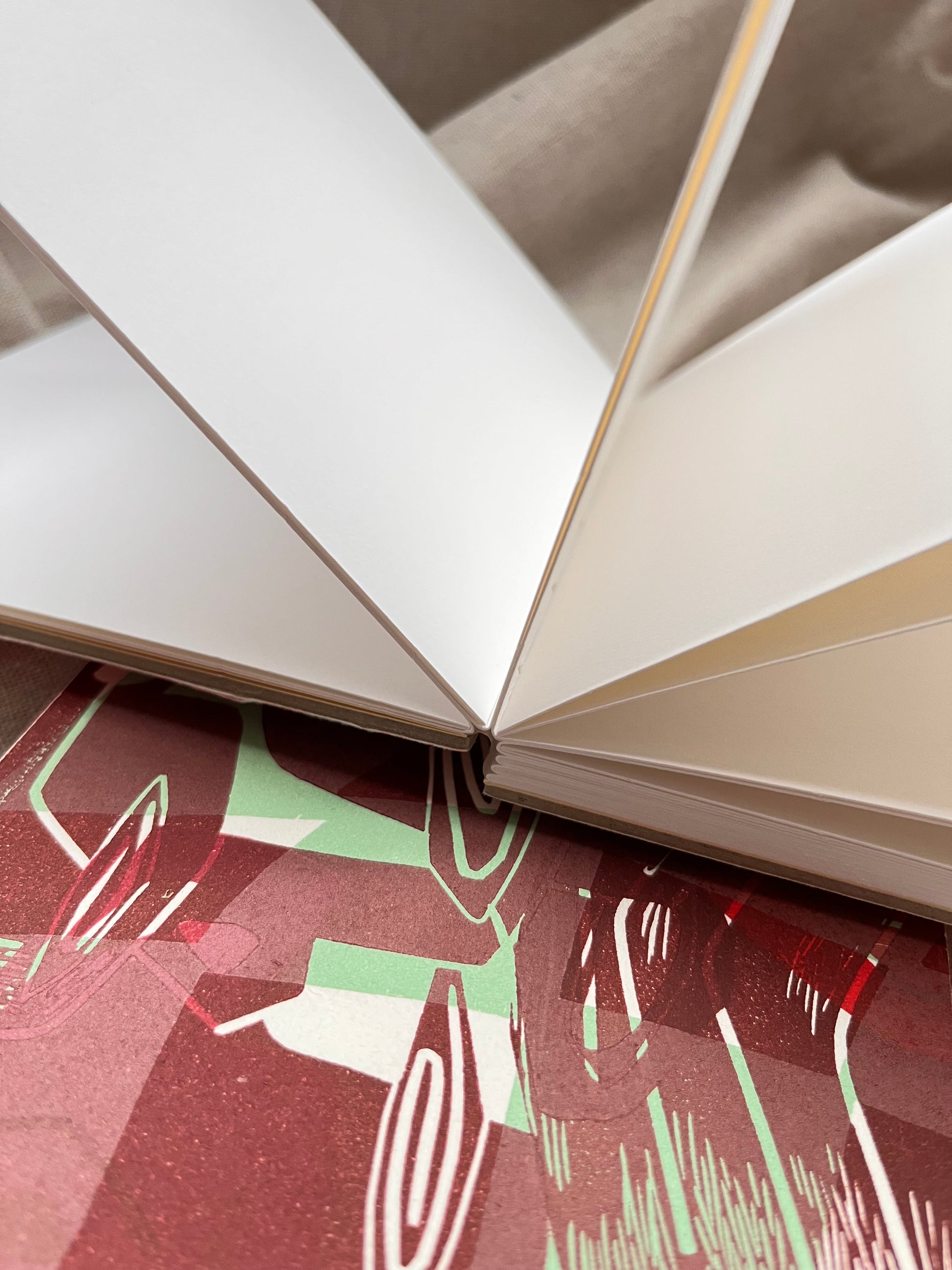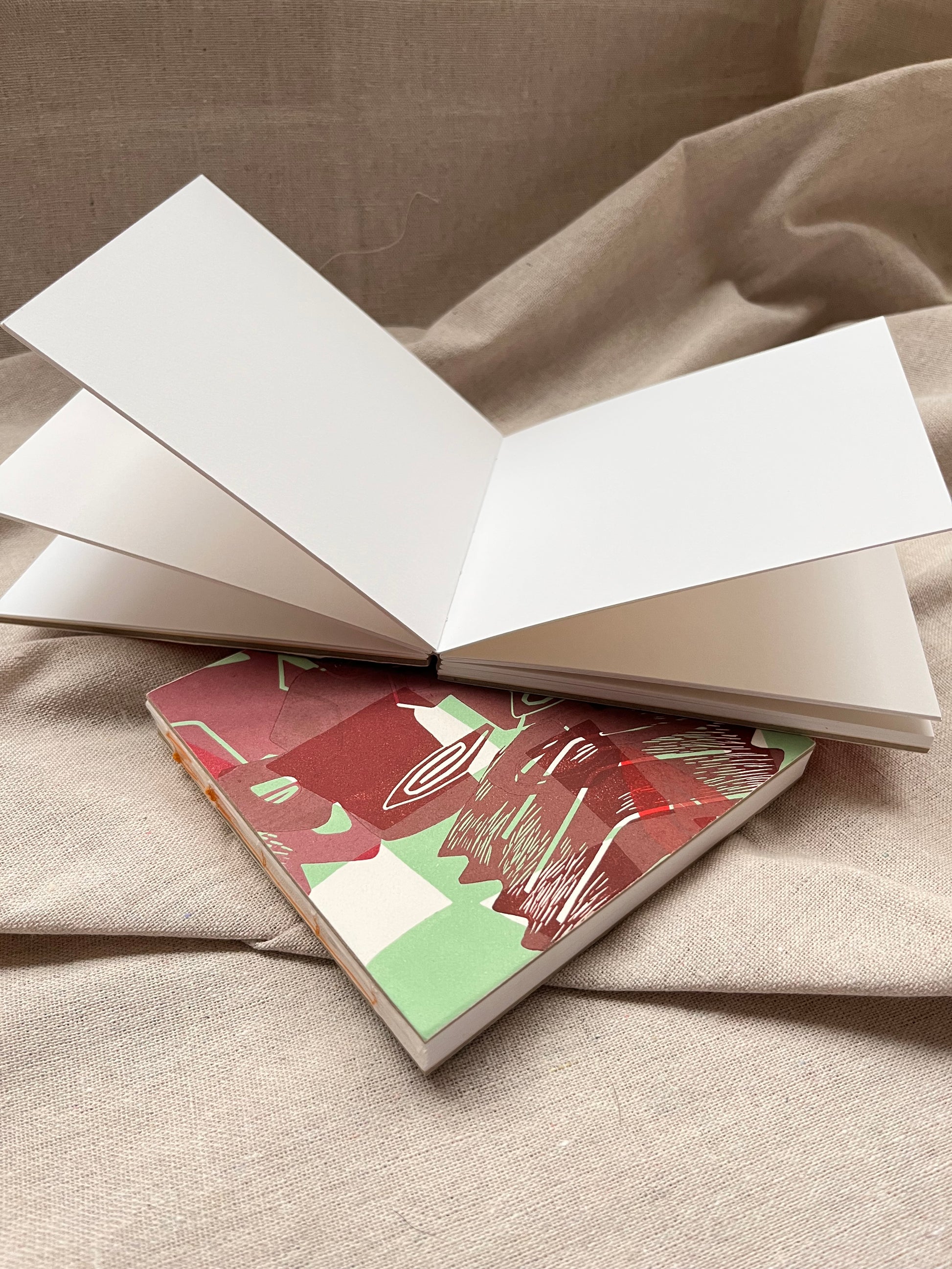 Bloc encuadernado a mano, tapa dura y cosido visto. Portada y contraportada a partir de pruebas de xilografías en papel Canson Edition 250gr. Cada ejemplar es ligeramente diferente al anterior al estar hechas de pruebas de grabado, por lo que es posible que contengan manchas y desperfectos.