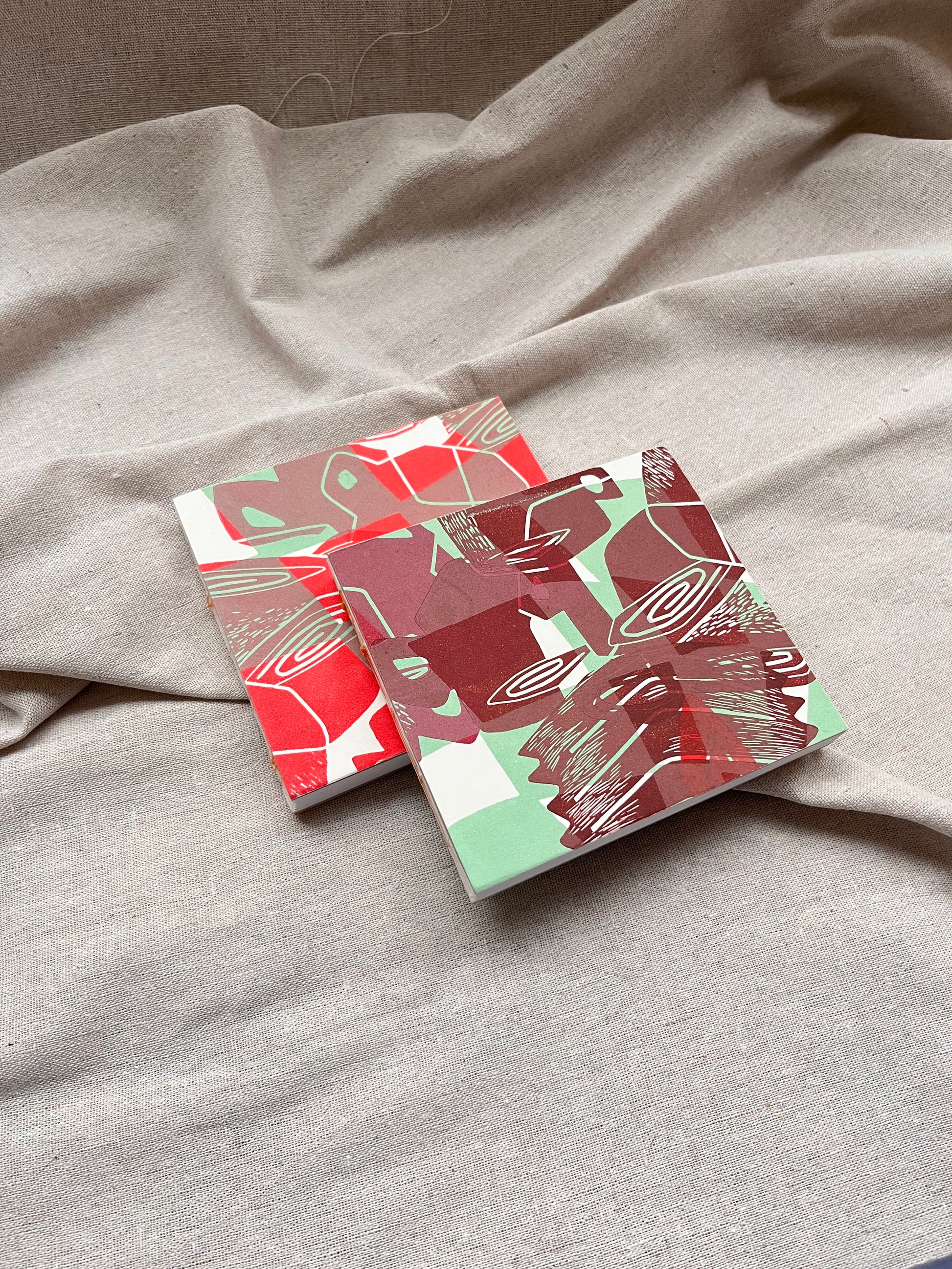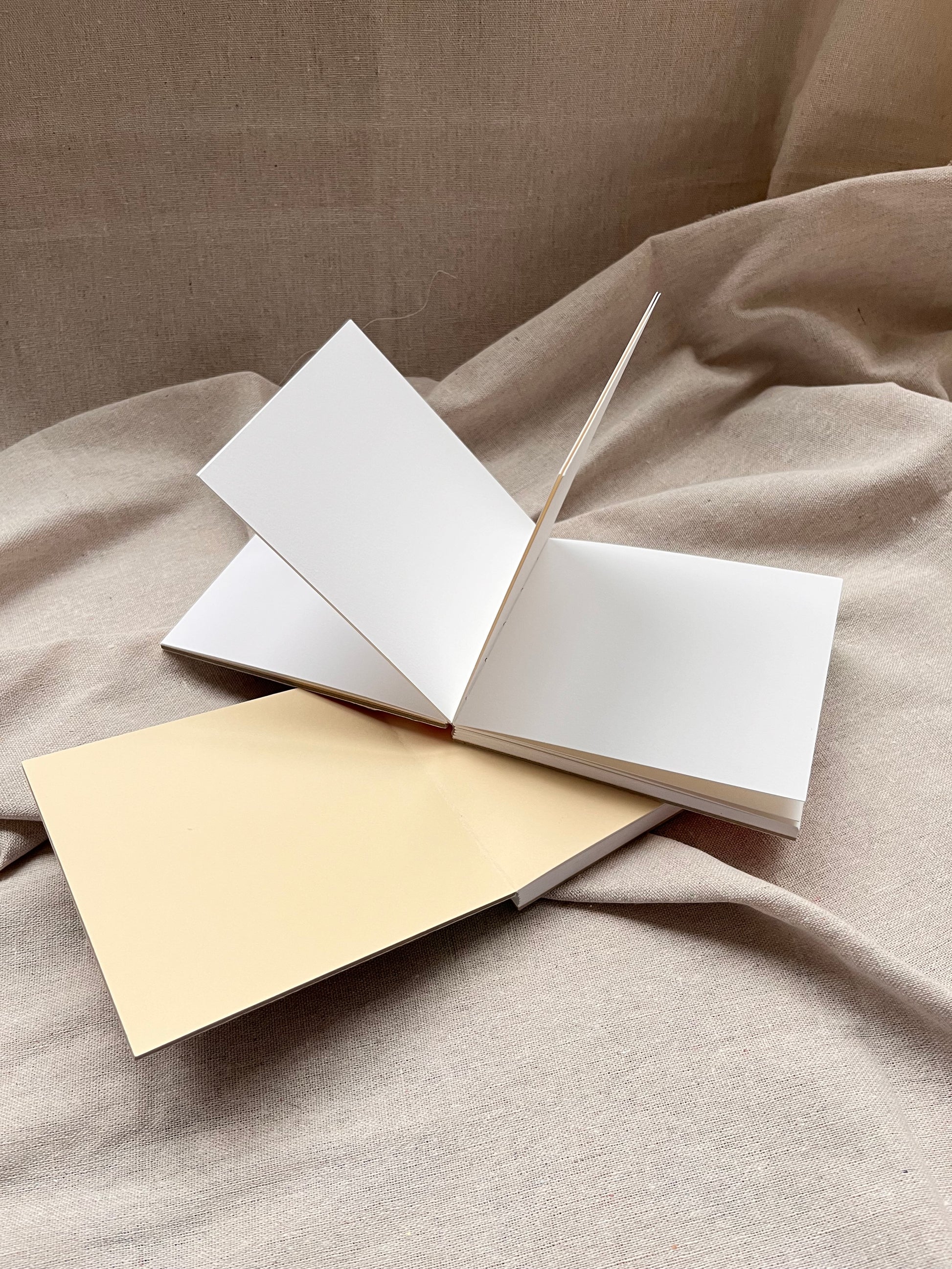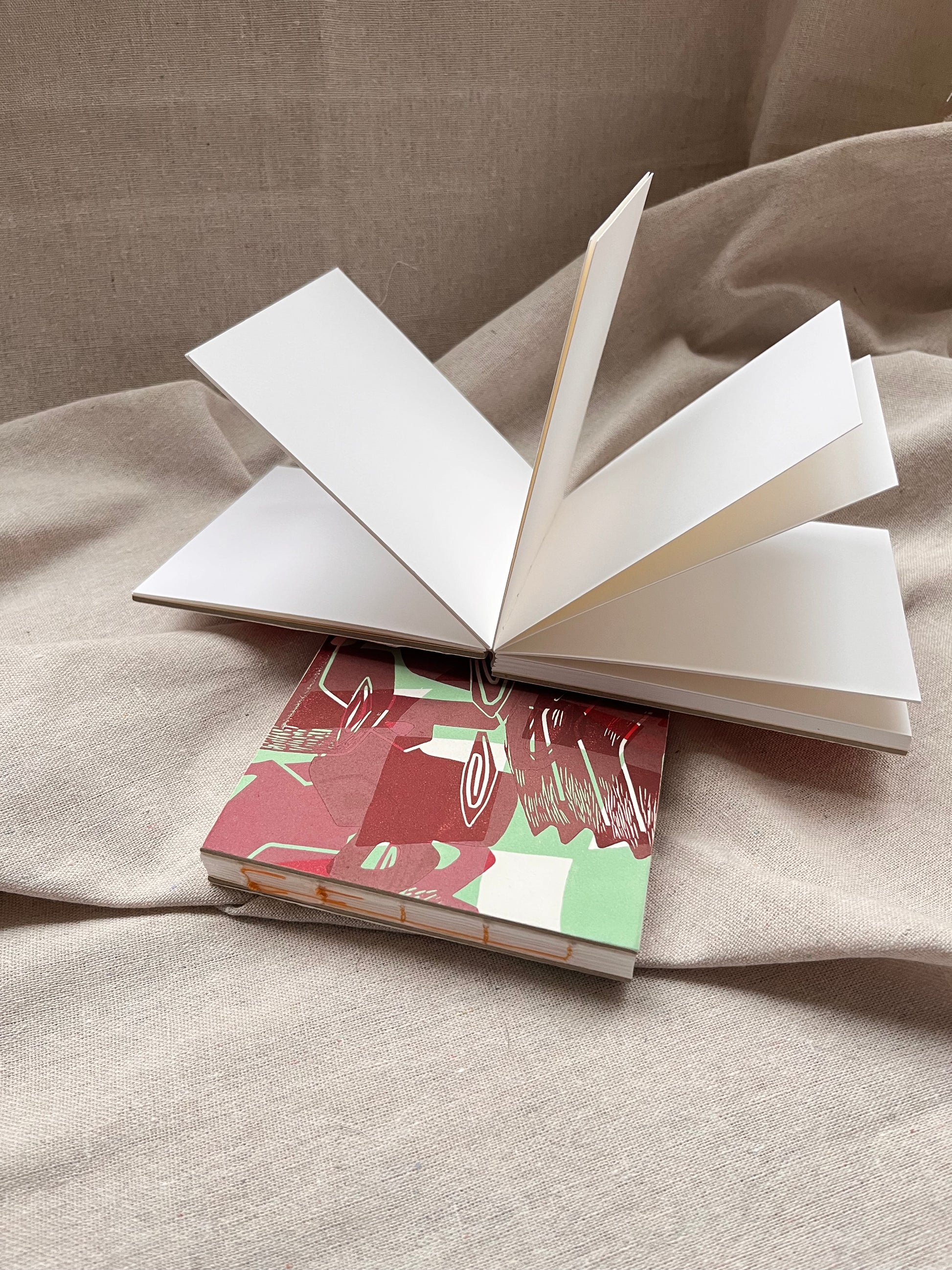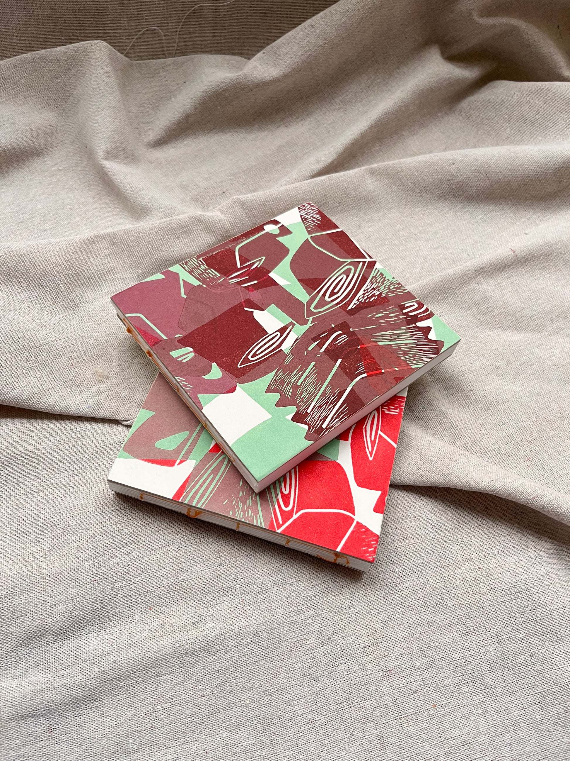 Bloc encuadernado a mano, tapa dura y cosido visto. Portada y contraportada a partir de pruebas de xilografías en papel Canson Edition 250gr. Cada ejemplar es ligeramente diferente al anterior al estar hechas de pruebas de grabado, por lo que es posible que contengan manchas y desperfectos.