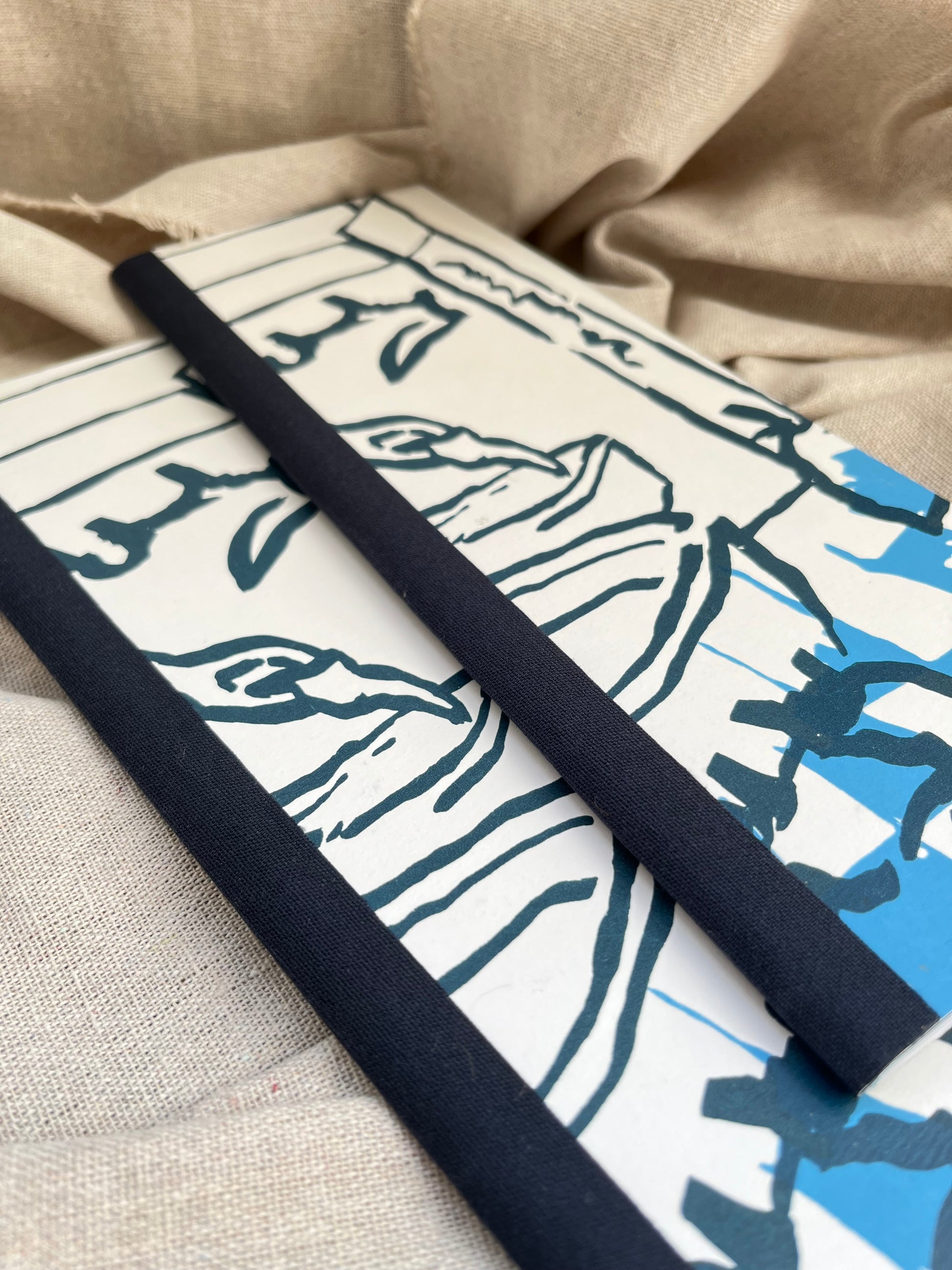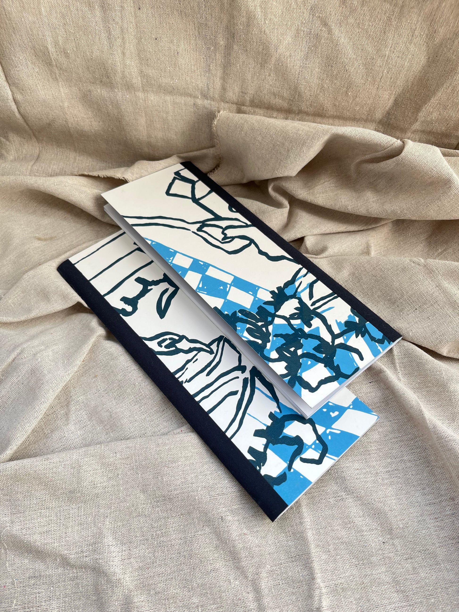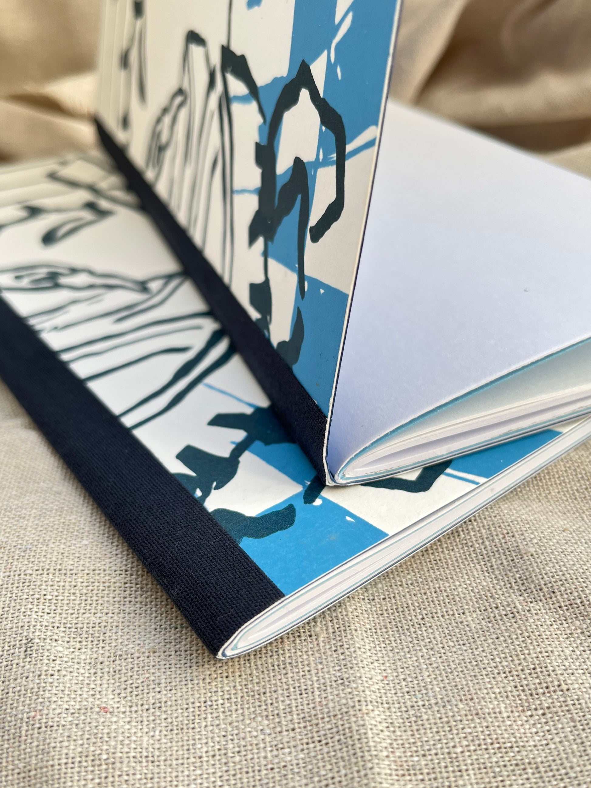 Libreta encuadernada a mano y tapa blanda. Portada y contraportada a partir de pruebas de serigrafías y lomos de tela. Cada ejemplar es ligeramente diferente al anterior al estar hechas de pruebas de grabado, por lo que es posible que contengan manchas y desperfectos.