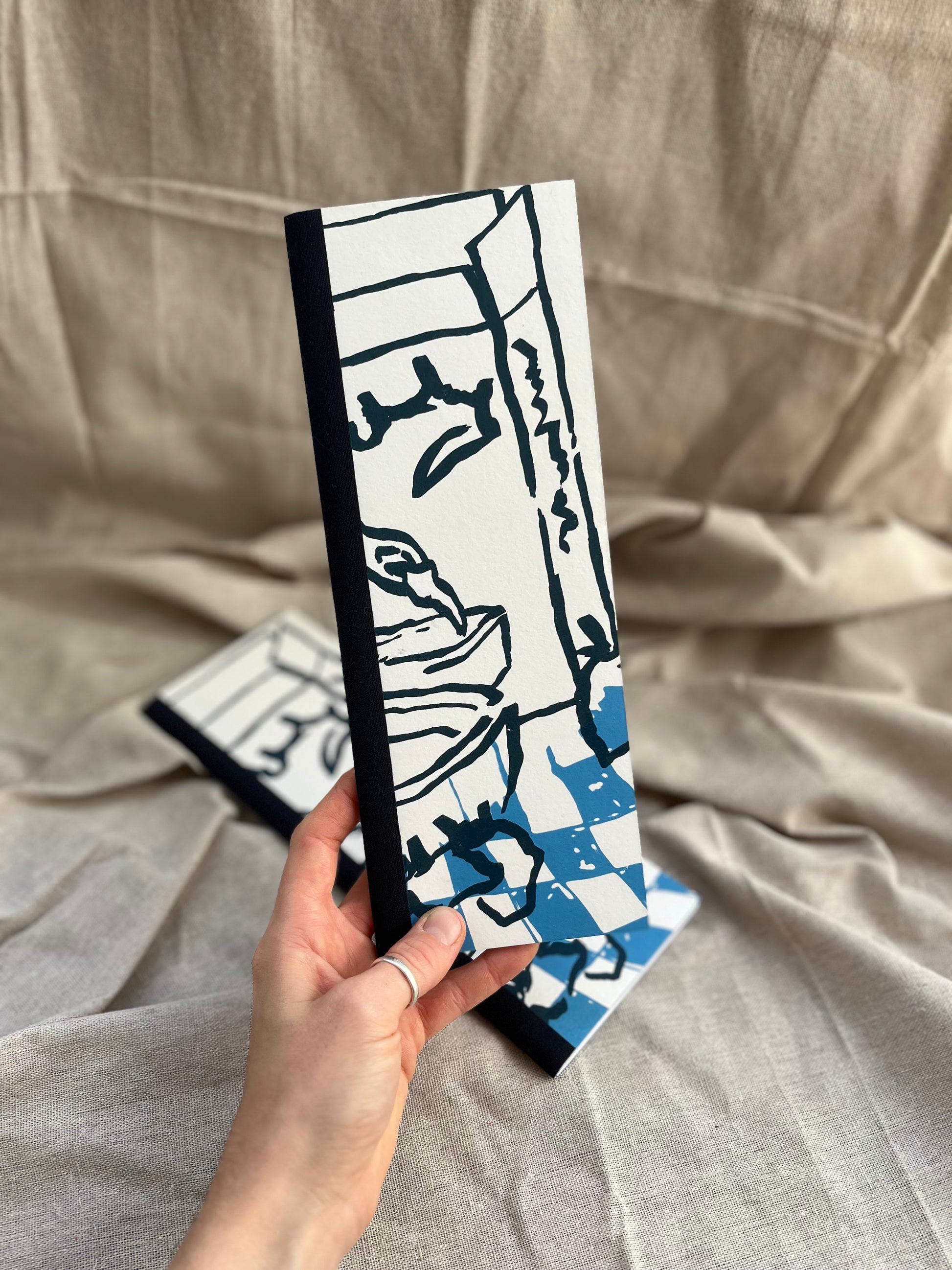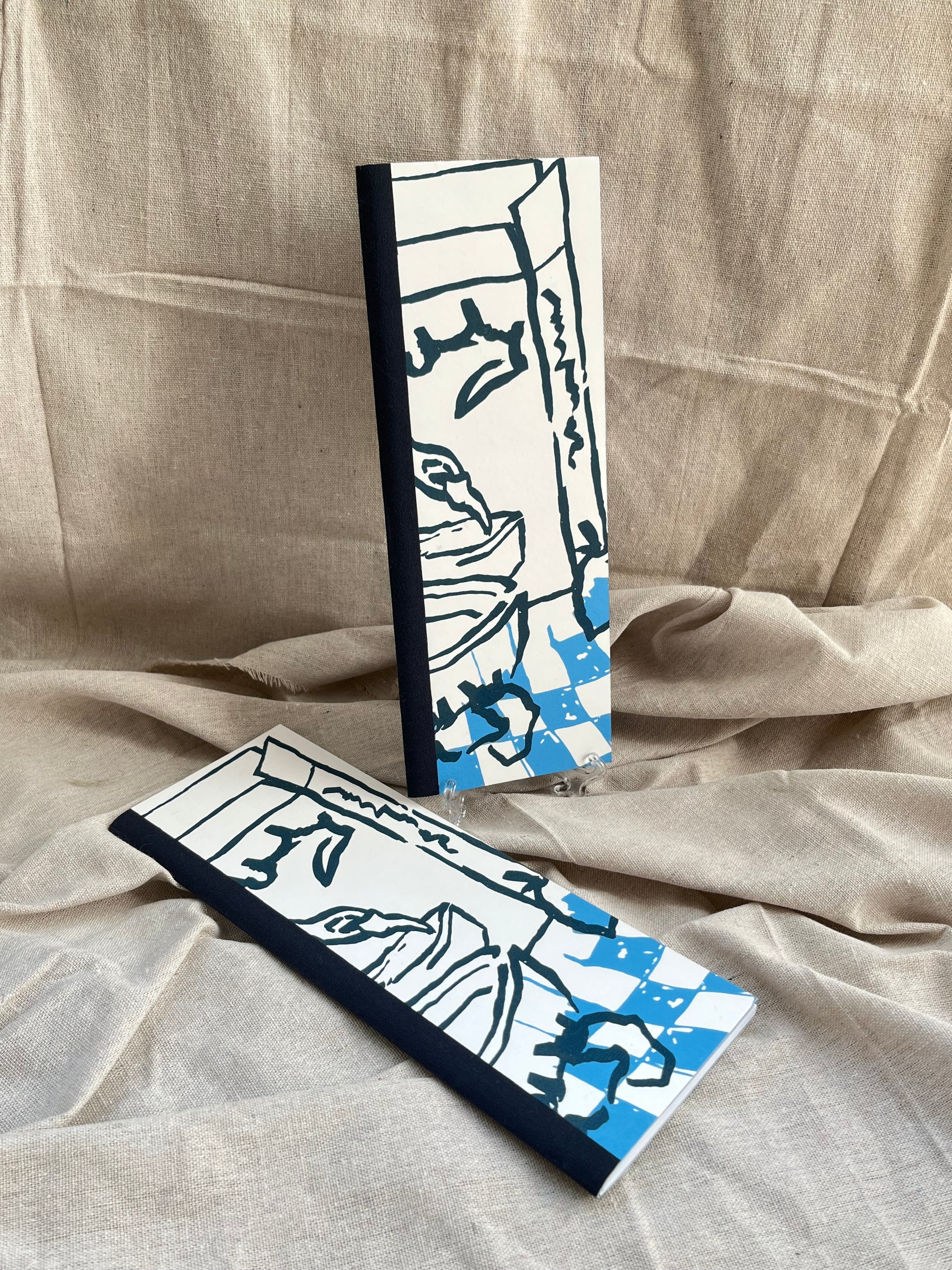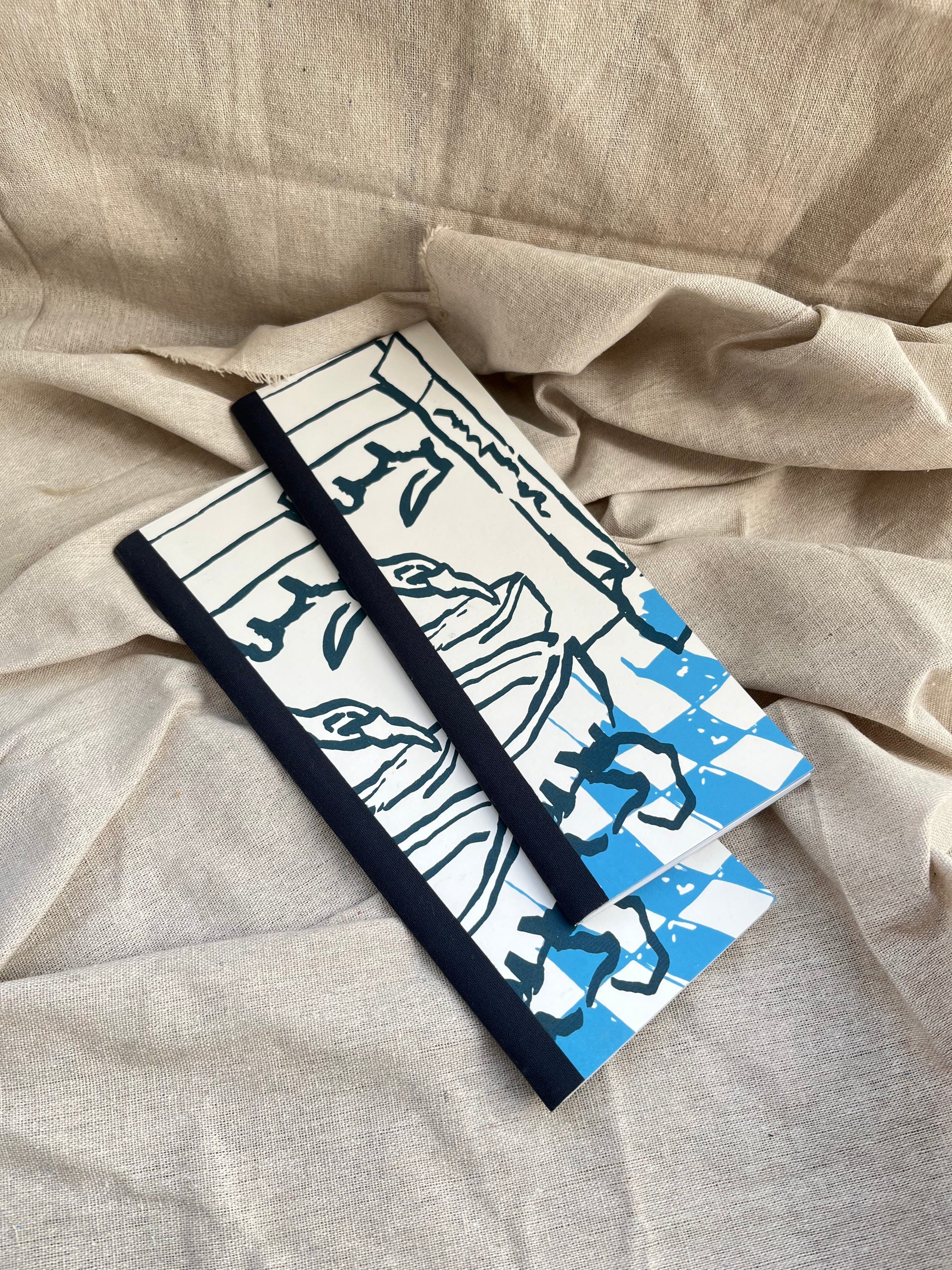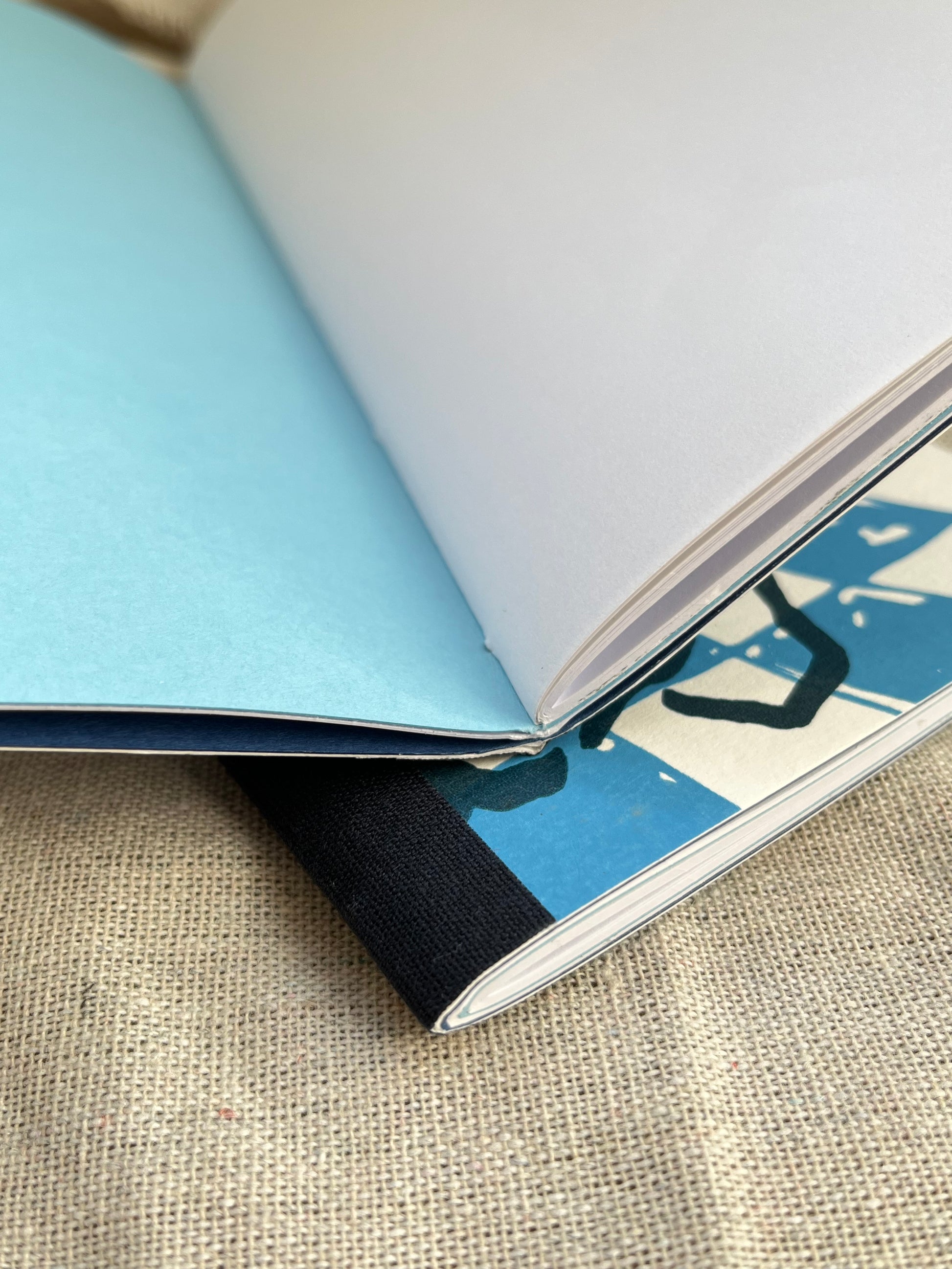 Libreta encuadernada a mano y tapa blanda. Portada y contraportada a partir de pruebas de serigrafías y lomos de tela. Cada ejemplar es ligeramente diferente al anterior al estar hechas de pruebas de grabado, por lo que es posible que contengan manchas y desperfectos.