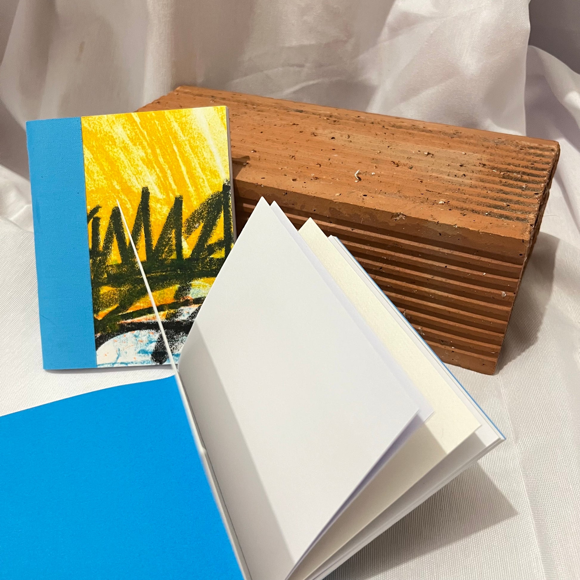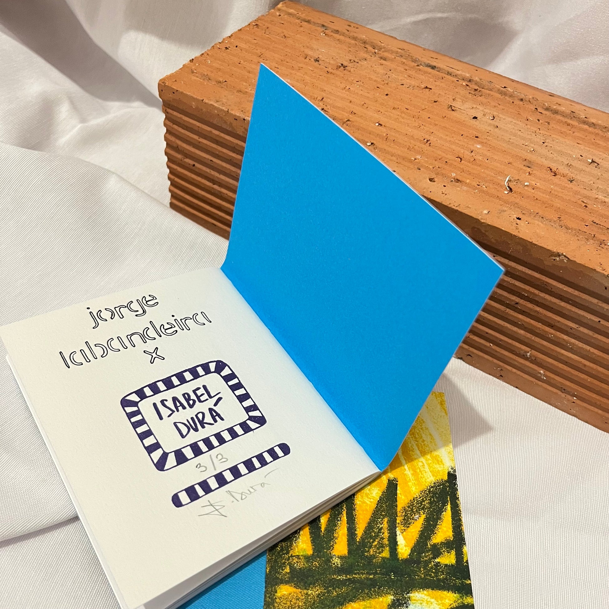 Libreta encuadernada a mano y tapa blanda. Portada y contraportada a partir de pruebas de xilografías del artista gráfico Jorge Labandeira y lomo de tela. Cada ejemplar es único y diferente al resto al estar hecho a partir de una prueba de grabado, por lo que es posible que contenga manchas y desperfectos, además de ser cada una ligeramente diferente.